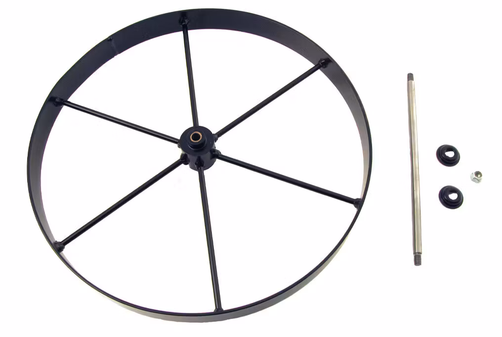 Extra 37 cm hjul i stål, allt övrigt som behövs för modifieringen.Axel, dammskydd och låsmutter.