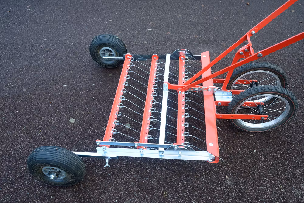 HarvvagnTerrateck (ombyggd hjulhacka) med 4 hjul och 36 st fjäderstå. Är utmärkt för att mylla ner frö som kastats ut och ligger i jordytan.